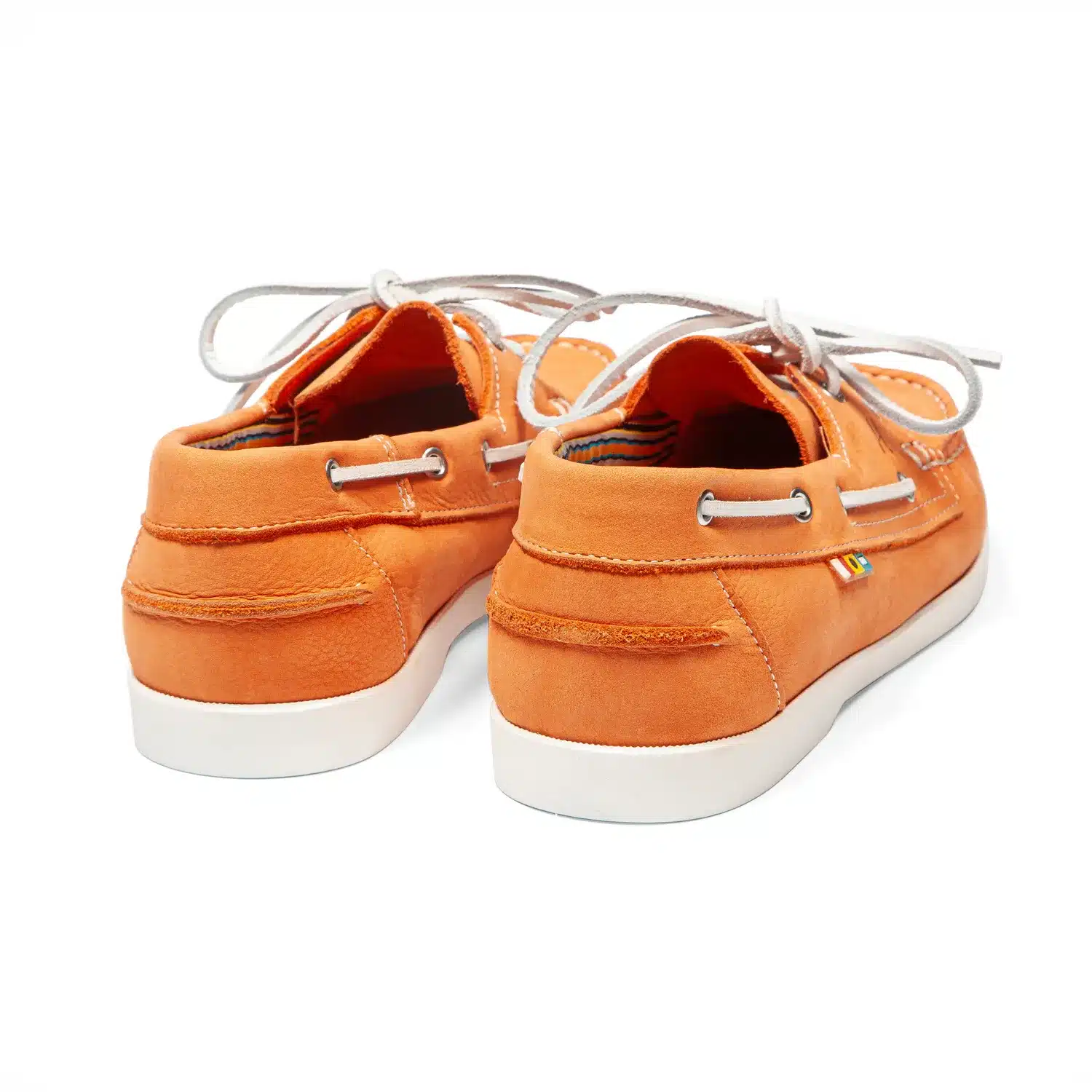Terrasse ombragée à Collioure puis balade sur le port aux barques catalanes : vos chaussures bateau HIPMOUTH ORANGE transforment l’été en manifeste de couleur assumé.