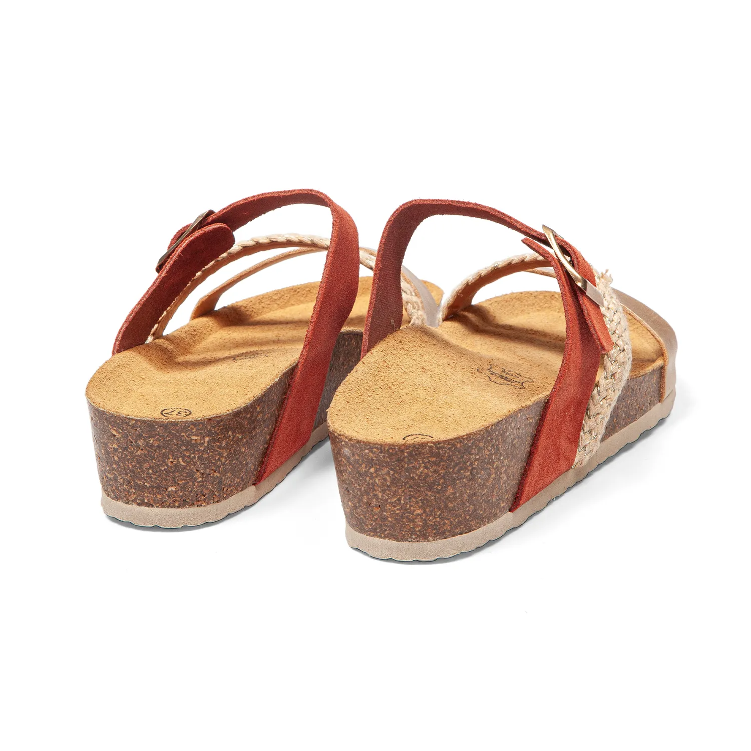 Synthétique corail velours de qualité qui apporte une douceur tactile et une couleur chaleureuse. Bride tressée naturelle beige qui évoque les paniers d’osier et l’artisanat méditerranéen authentique. Bride champagne dorée qui capte la lumière chaude du sud. Trois brides en synthétique qui se croisent harmonieusement : corail velouté, tressage naturel et champagne lumineux. La semelle intermédiaire en liège naturel, visible et authentique, révèle l’ADN AROS. Un style chaleureux qui marie corail méditerranéen, tressage artisanal et éclat doré, cette élégance estivale qui réchauffe vos pas. Synthétique résistant et facile d’entretien, doublure microfibre confortable qui enveloppe votre pied délicatement. - Conception tricouche : marcher sur des nuages