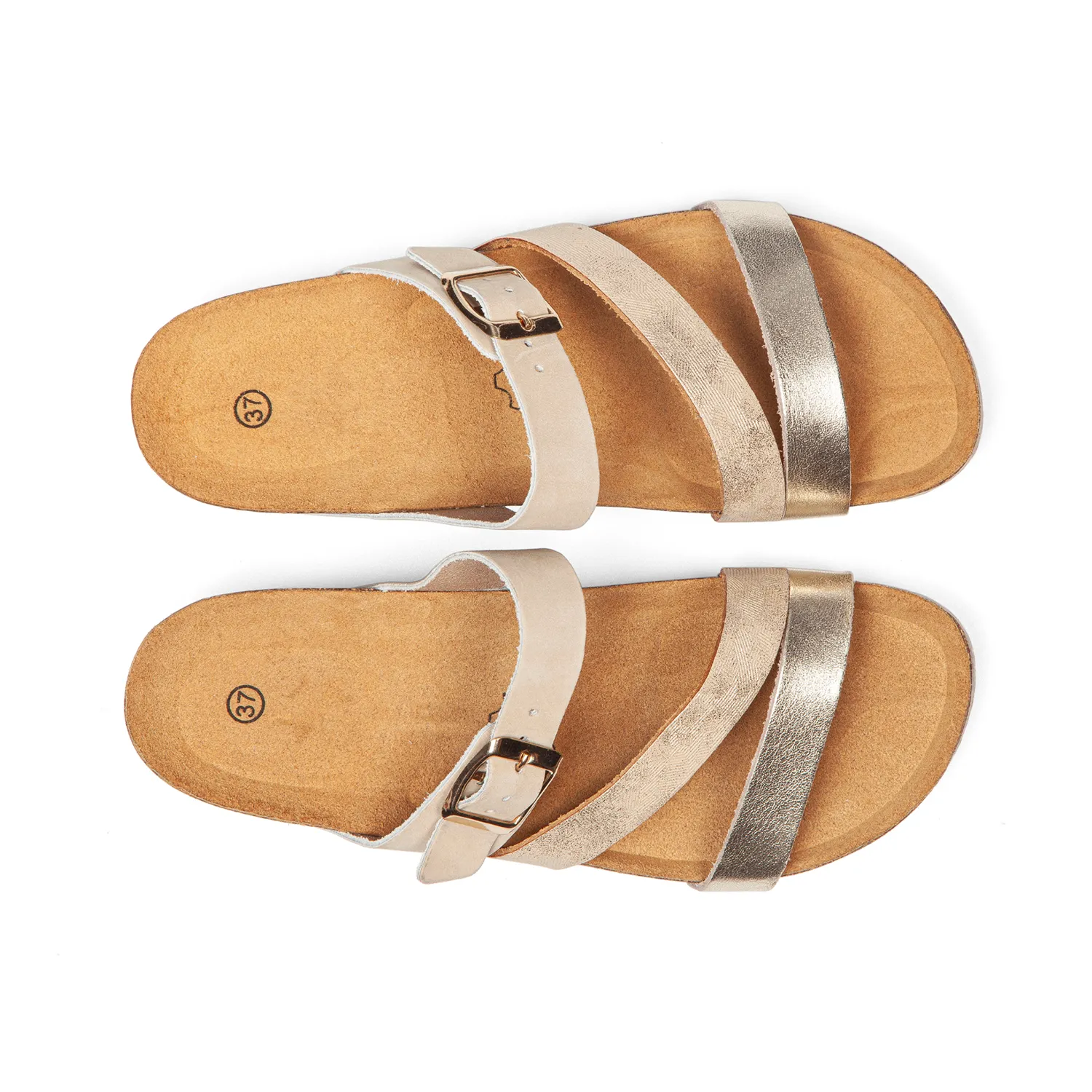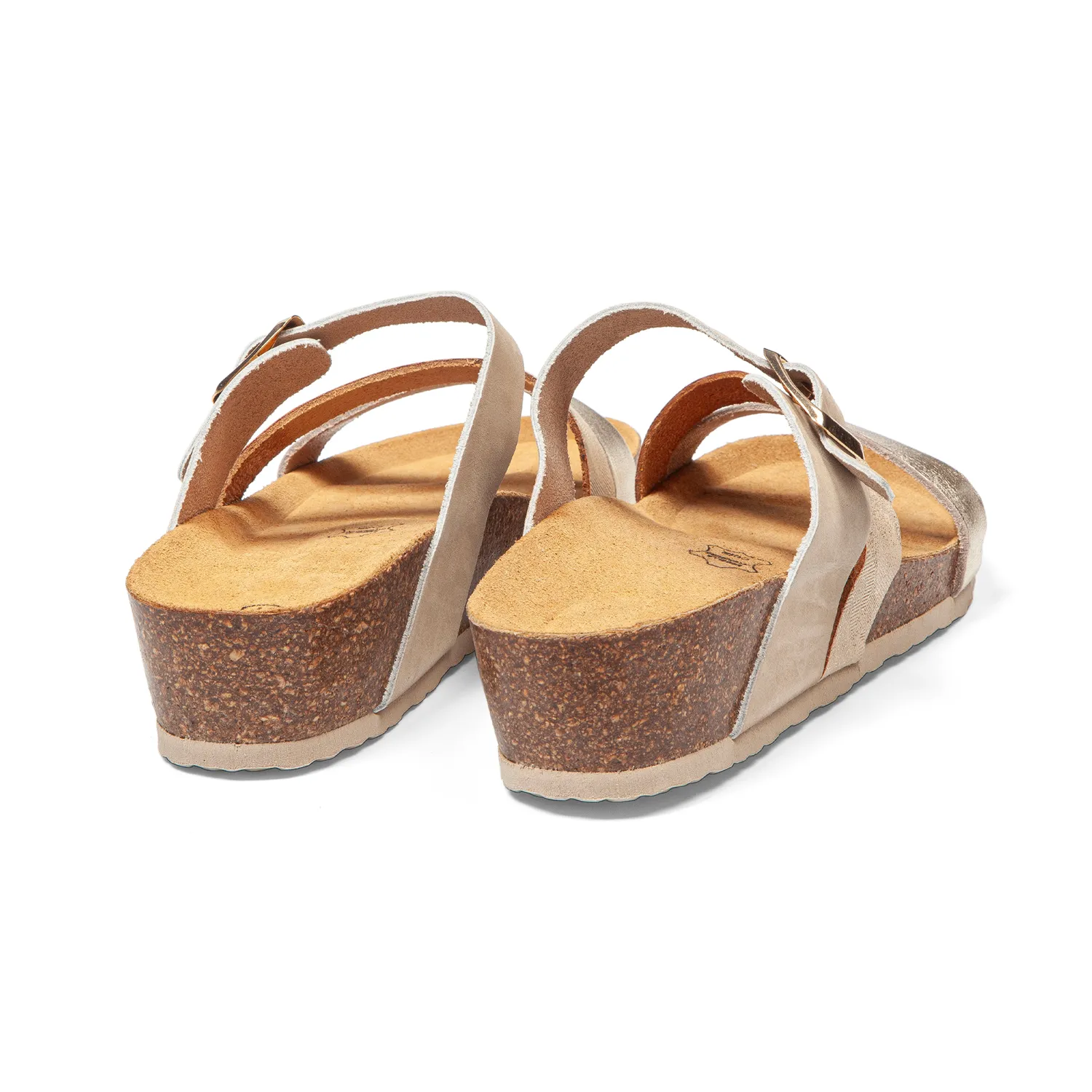 Cuir beige lisse sélectionné dans des tanneries auditées. Cuir imprimé texturé beige qui apporte une profondeur subtile et raffinée. Cuir champagne métallisé qui capte la lumière dorée à chaque pas. Trois brides en cuir labellisé LWG qui se croisent harmonieusement : beige sobre, imprimé texturé et champagne lumineux. La semelle intermédiaire en liège naturel, visible et authentique, révèle l’ADN AROS. Un style féminin qui marie beige doux, texture délicate et éclat doré, cette élégance raffinée qui sublime vos pas en été. Cuir noble non doublé qui respire naturellement, légèreté absolue pour les journées chaudes. - Conception tricouche : marcher sur des nuages
