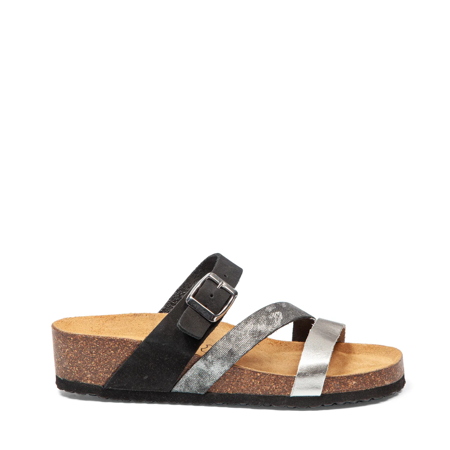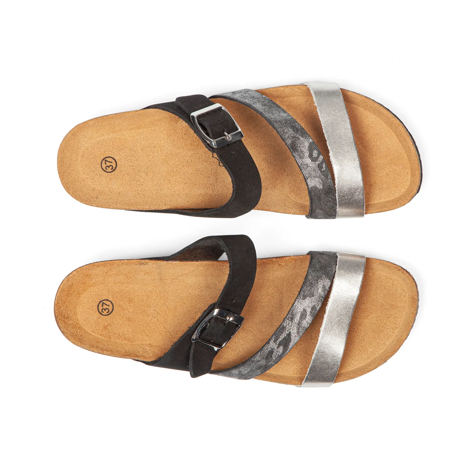 Cuir noir lisse sélectionné dans des tanneries auditées. Cuir imprimé graphique noir et argent qui apporte un contraste moderne et sophistiqué. Cuir argent métallisé qui capte la lumière à chaque pas. Trois brides en cuir labellisé LWG qui se croisent harmonieusement : noir sobre, imprimé graphique et argent lumineux. La semelle intermédiaire en liège naturel, visible et authentique, révèle l’ADN AROS. Un style affirmé qui marie noir profond, motif géométrique et éclat métallisé, cette élégance urbaine qui distingue vos pas en ville. Cuir noble non doublé qui respire naturellement, légèreté absolue pour les journées chaudes.