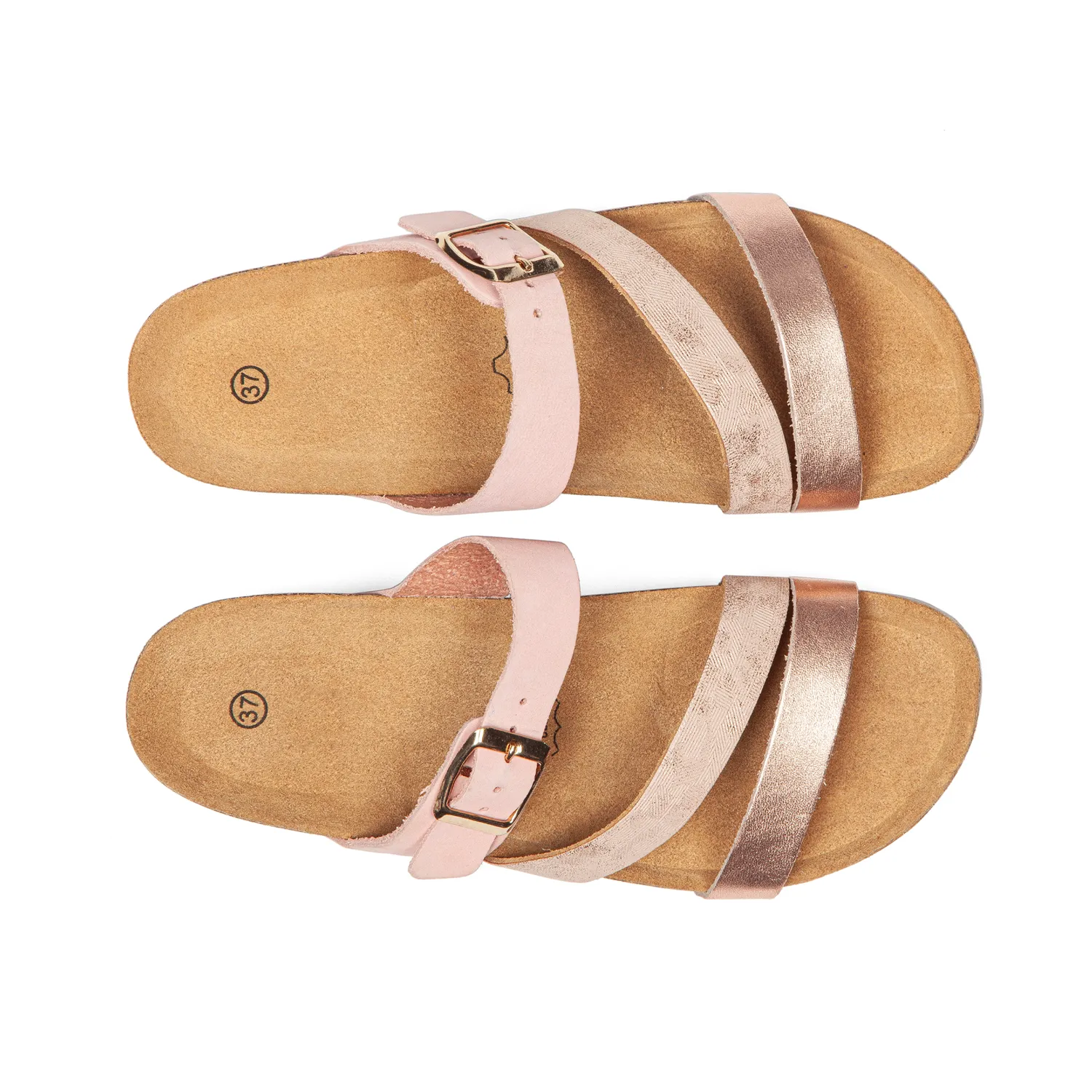 Cuir rose poudré lisse sélectionné dans des tanneries auditées. Cuir imprimé texturé beige rosé qui apporte une douceur délicate et féminine. Cuir rose doré métallisé aux reflets cuivrés qui capte la lumière chaude à chaque pas. Trois brides en cuir labellisé LWG qui se croisent harmonieusement : rose poudré tendre, imprimé texturé et rose doré lumineux. La semelle intermédiaire en liège naturel, visible et authentique, révèle l’ADN AROS. Un style romantique qui marie rose doux, texture subtile et éclat cuivré, cette élégance tendre qui enveloppe vos pas en été. Cuir noble non doublé qui respire naturellement, légèreté absolue pour les journées chaudes. - Conception tricouche : marcher sur des nuages