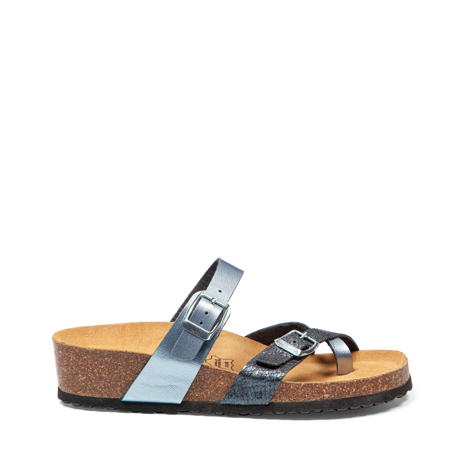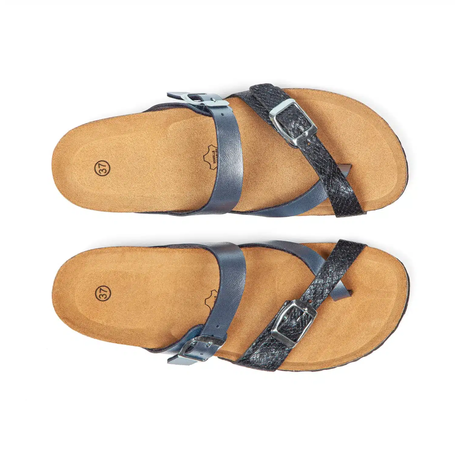 Synthétique de qualité sélectionné pour sa résistance et son entretien facile. L’azur métallisé évoque les reflets de la mer méditerranéenne à midi. L’imprimé reptile bleu marine apporte une sophistication sauvage raffinée qui rappelle les écailles de poisson. Deux boucles de réglage argentées qui ajoutent une touche argent à vos pieds. La semelle intermédiaire en liège naturel, visible et authentique, révèle l’ADN AROS. Un style maritime qui marie tons d’azur, textures marines et éclat argenté, cette élégance qui respire l’été côtier. Synthétique résistant aux projections d’eau, doublure microfibre confortable qui enveloppe délicatement votre pied.