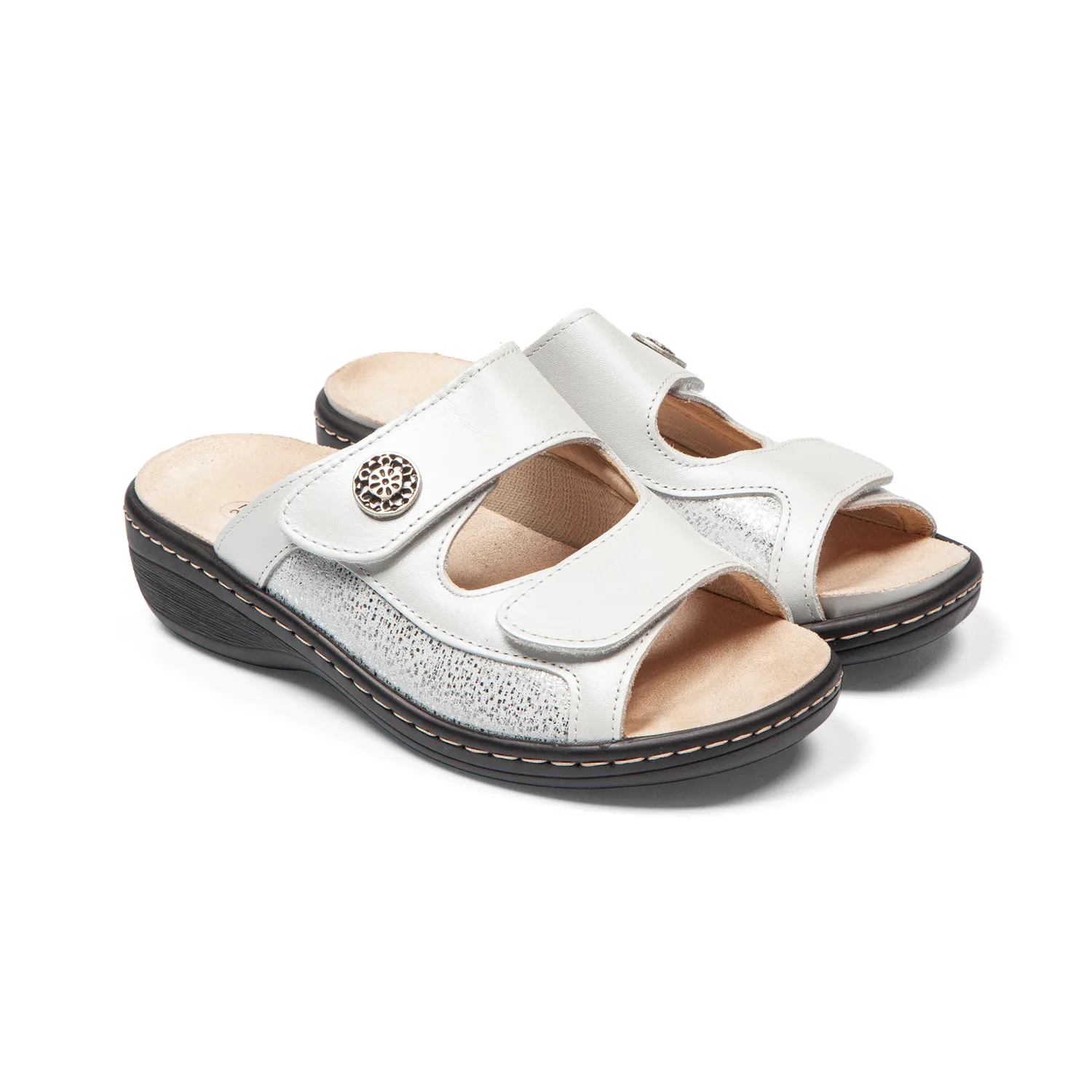 Cuir labellisé LWG blanc avec reflets nacrés qui apporte fraîcheur et élégance. L’empiècement en textile stretch argenté s’adapte délicatement à la morphologie particulière de votre pied sans jamais comprimer. Les découpes arrondies et les boutons décoratifs apportent une touche de féminité raffinée. Une mule qui célèbre votre élégance tout en respectant vos besoins spécifiques.