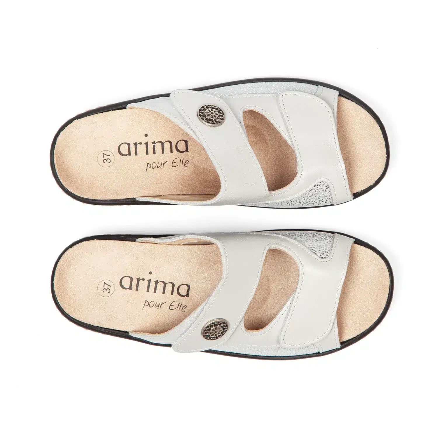 Plus d’un siècle d’expertise ARIMA – cette mule spéciale largeur confort vous entoure dans votre quotidien avec la promesse du respect absolu de vos pieds sensibles.