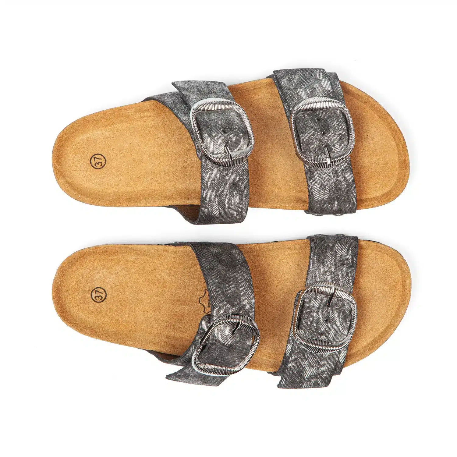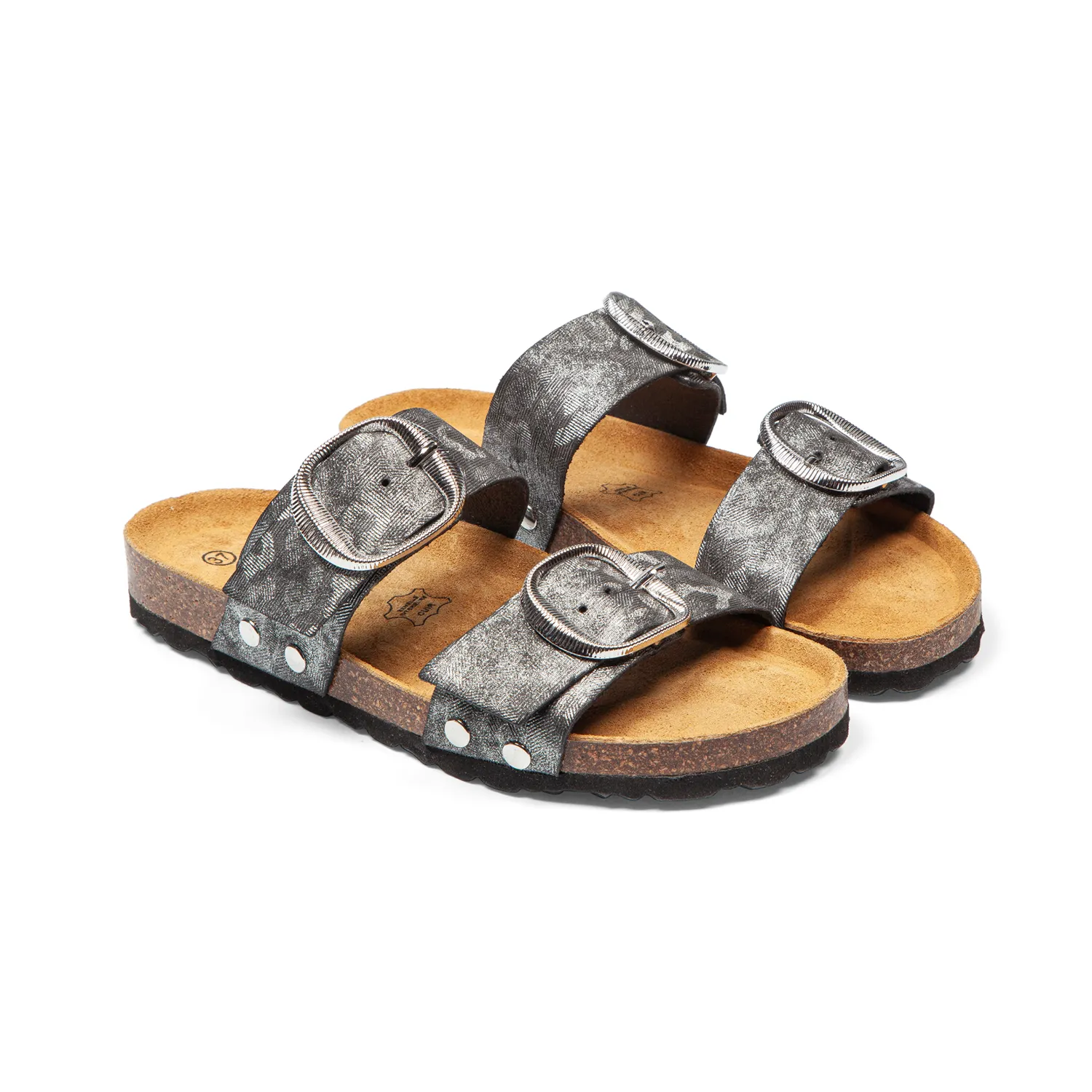 Deux brides généreuses qui sculptent votre pied avec assurance. Les grandes boucles ovales argentées se règlent séparément pour un maintien personnalisé. Largeur standard qui accueille votre pied sans contrainte. Maintien affirmé qui ne craint pas d’être vu, vous glissez vos pieds en un geste. - Semelle EVA souple + liège isolant