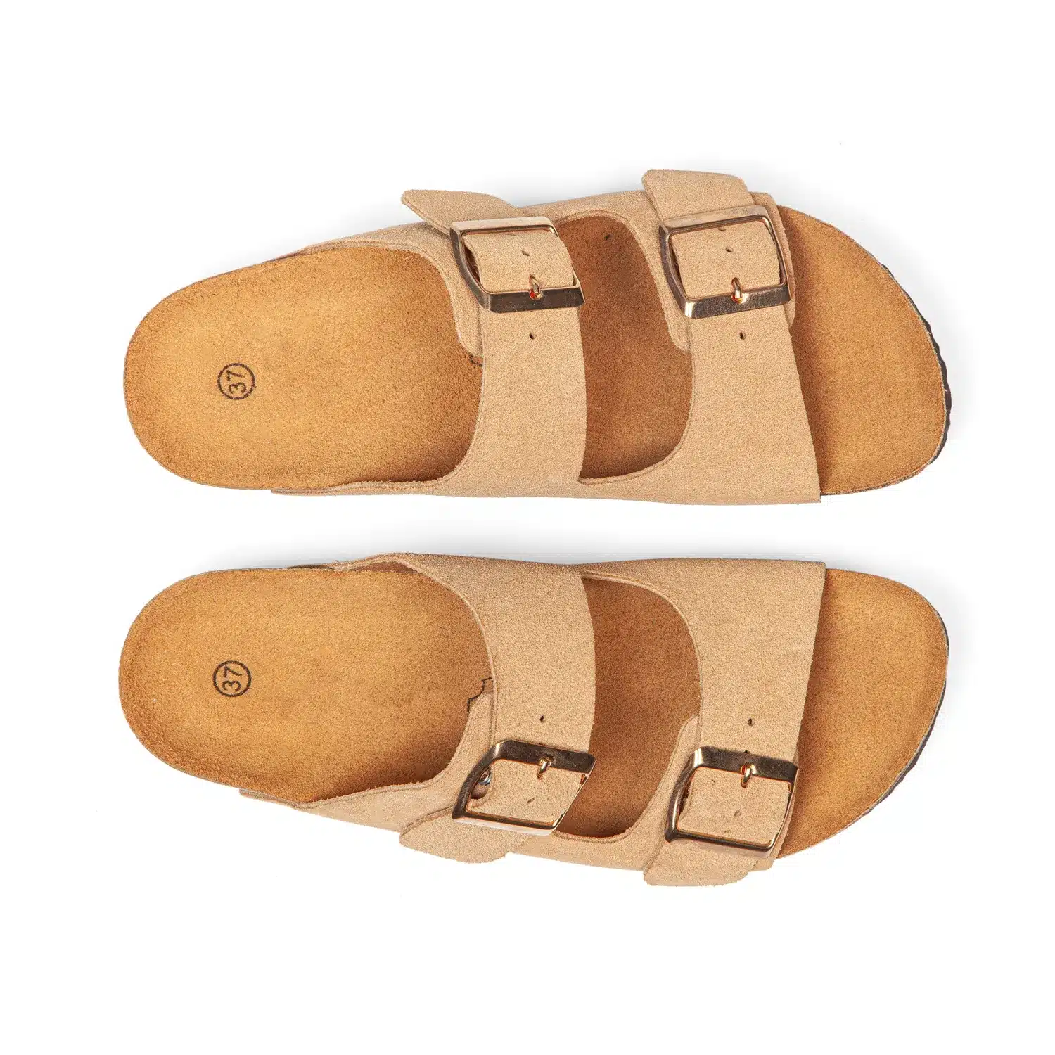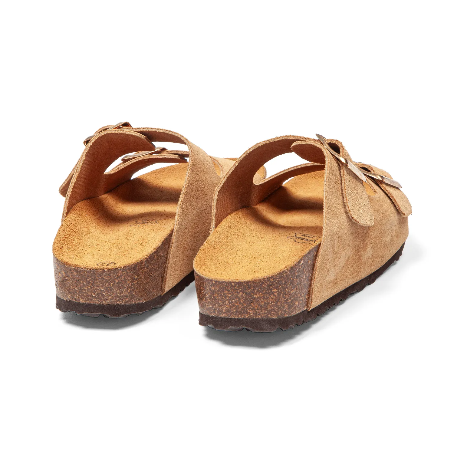 Cuir pleine fleur velouté sélectionné dans des tanneries labellisées qui respectent l’environnement. Le velours beige sable offre une douceur tactile incomparable, se bonifie avec le temps. La surface unie sans motif cultive une élégance épurée intemporelle. Deux brides larges et sobres avec boucles carrées dorées minimalistes qui dessinent une géométrie pure. L’absence de rivets affirme cette quête de simplicité essentielle. La semelle intermédiaire en liège naturel, visible et authentique, révèle l’ADN AROS. Un style minimaliste qui marie velours doux, lignes épurées et détails dorés discrets, cette élégance qui repose l’œil autant que le pied. Cuir non doublé qui enveloppe naturellement, semelle intérieure cuir qui se façonne à votre anatomie unique. - Conception tricouche : marcher sur des nuages
