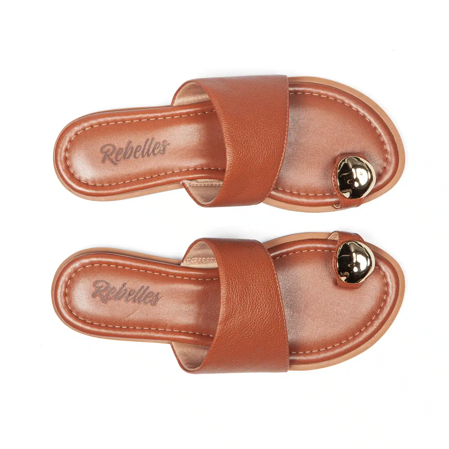 Cuir souple dans un ton chaud intemporel qui se patine avec élégance. Le bijou doré sculpté sur l’anneau d’orteil transforme vos pieds en véritable parure. Un détail orfèvre discret mais remarqué, qui ajoute du caractère sans tomber dans l’excès. - Semelle plate ultra-confort 3 cm