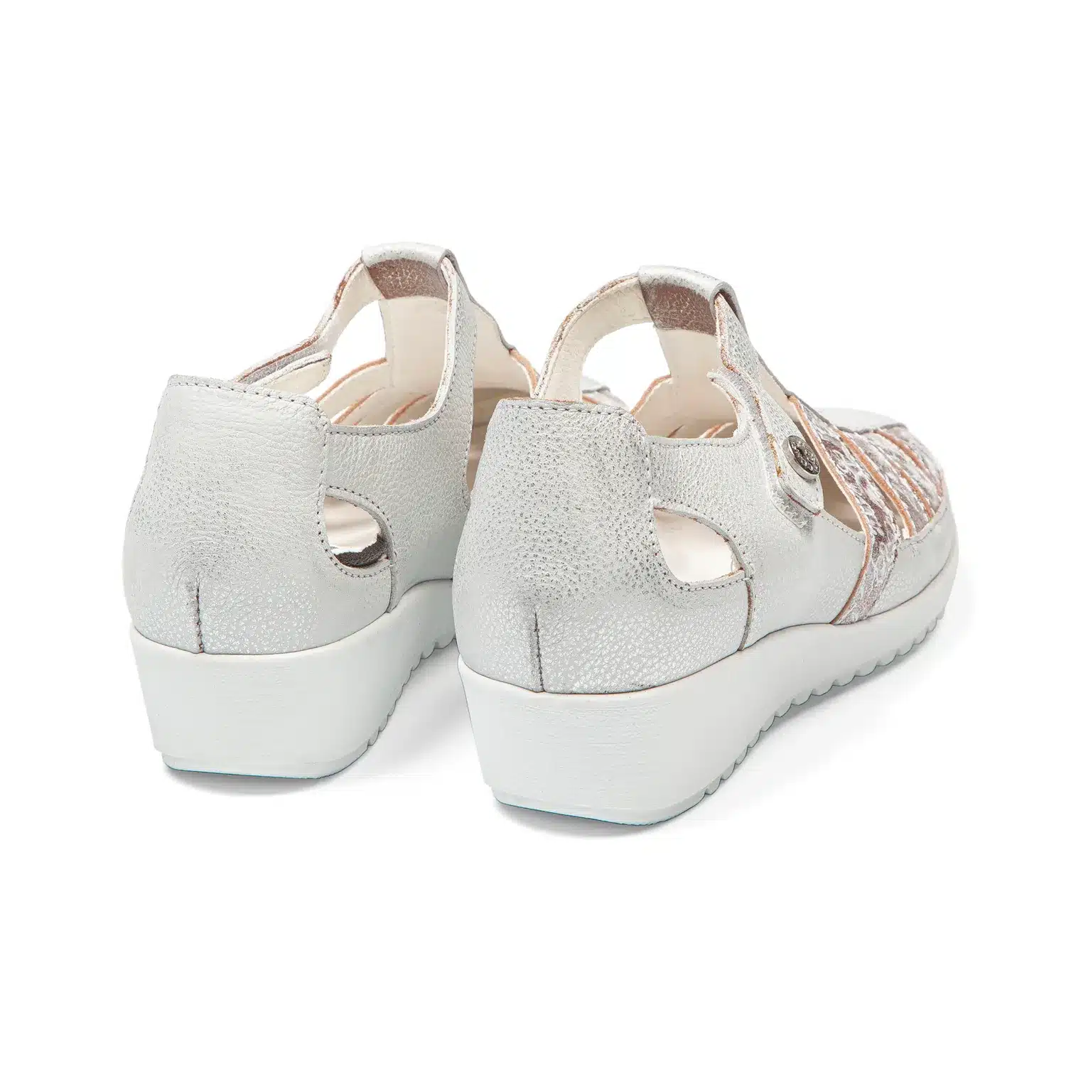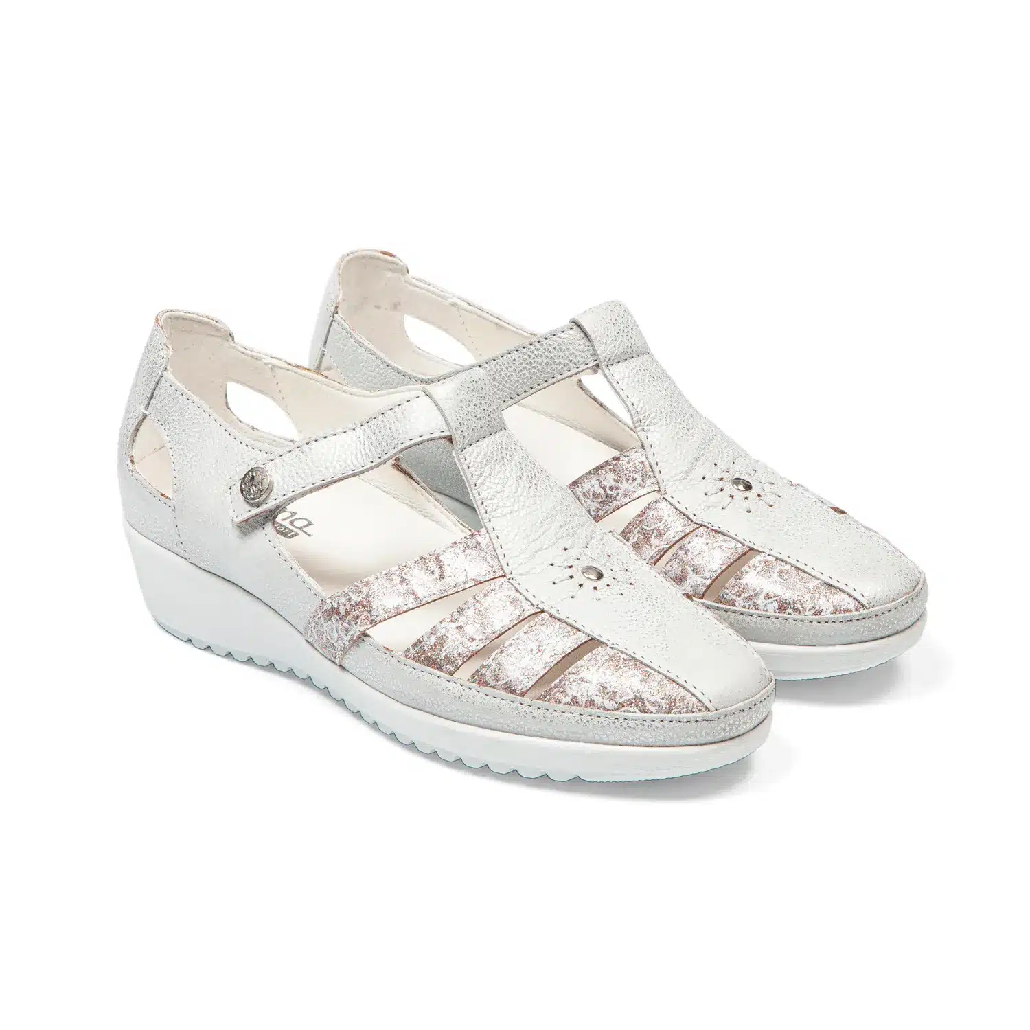 Cuir labellisé LWG dans un blanc lumineux qui apporte fraîcheur et élégance. L’empiècement avant aux reflets argentés rosés crée un jeu de lumière sophistiqué. Le détail floral sur la tige ajoute cette touche féminine délicate. Une sandale qui combine confort et allure raffinée sans effort. - Semelle compensée progressive 3,5 cm + avant rehaussé 1,5 cm