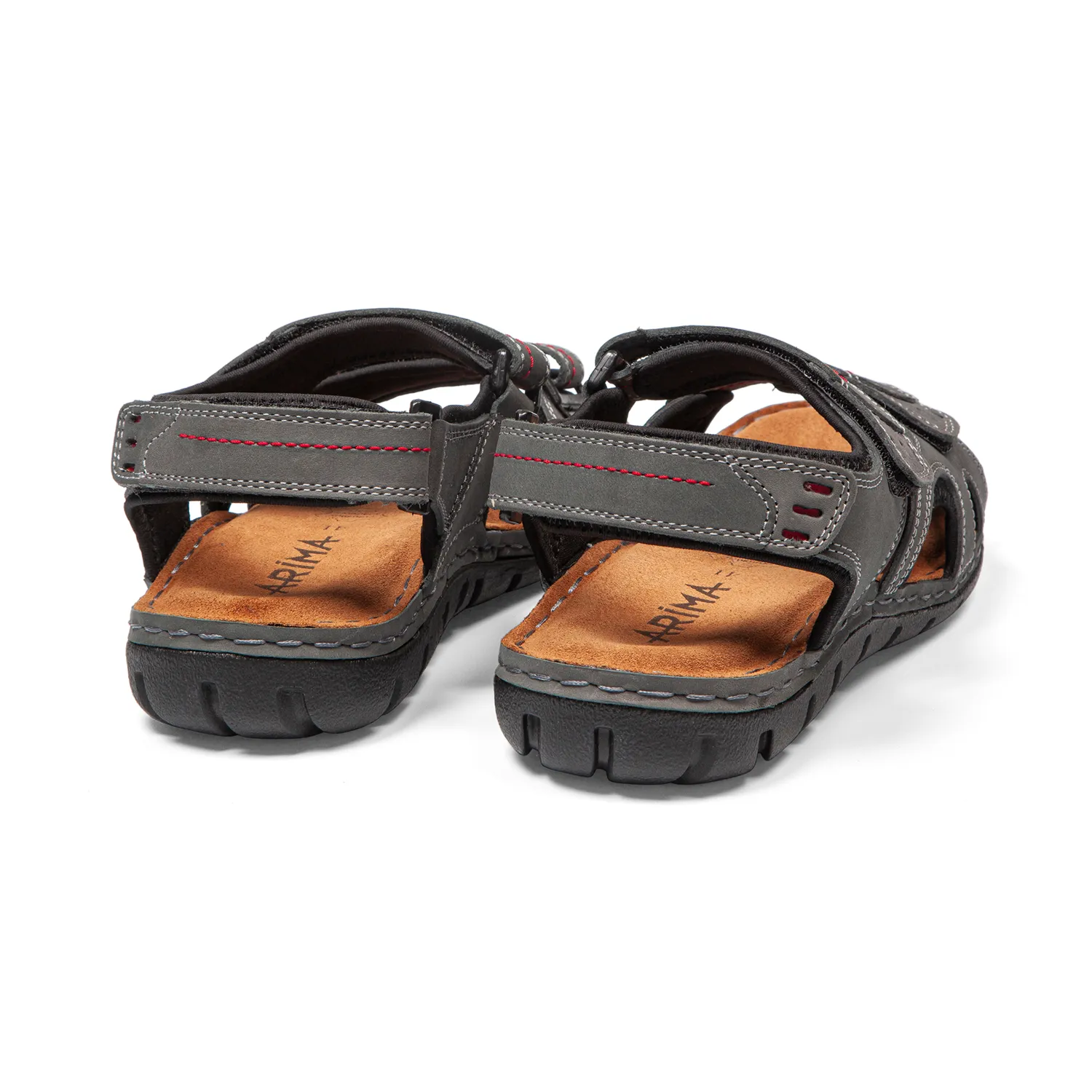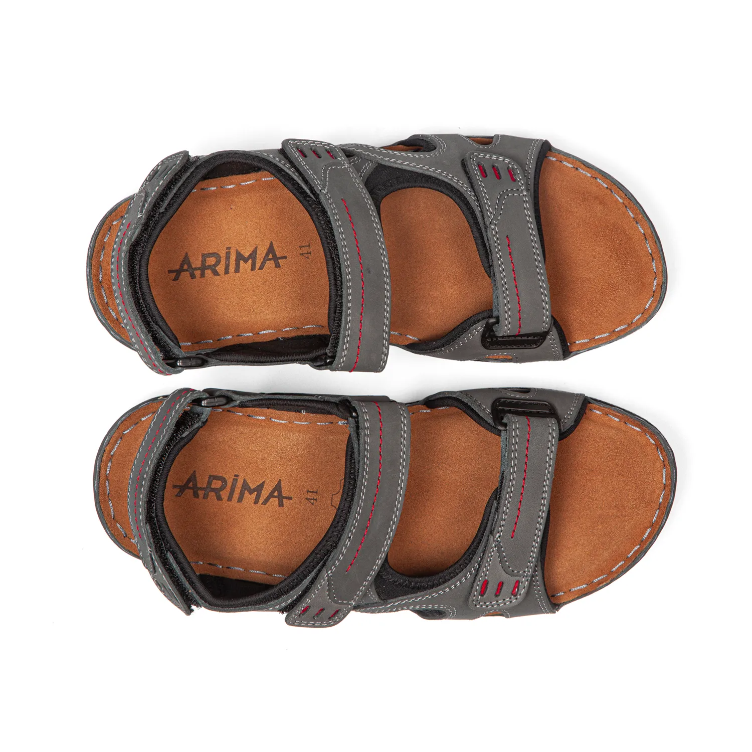 Cuir dans un gris jean robuste avec surpiqûres et perforations rouges discrètes. Finition mate qui résiste au temps. Un duo de couleurs qui marche sans en faire trop. - Triple bride velcro ajustable