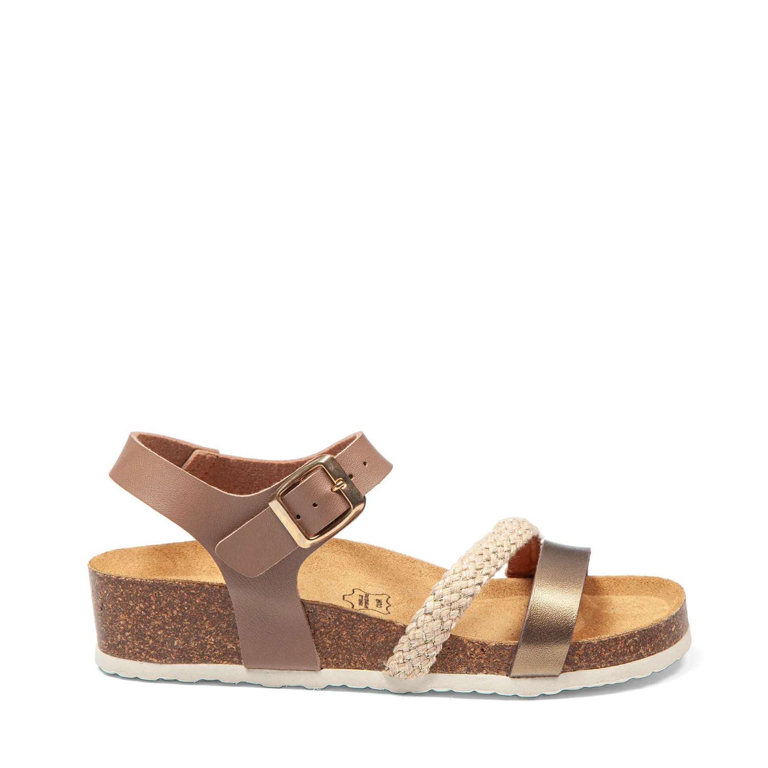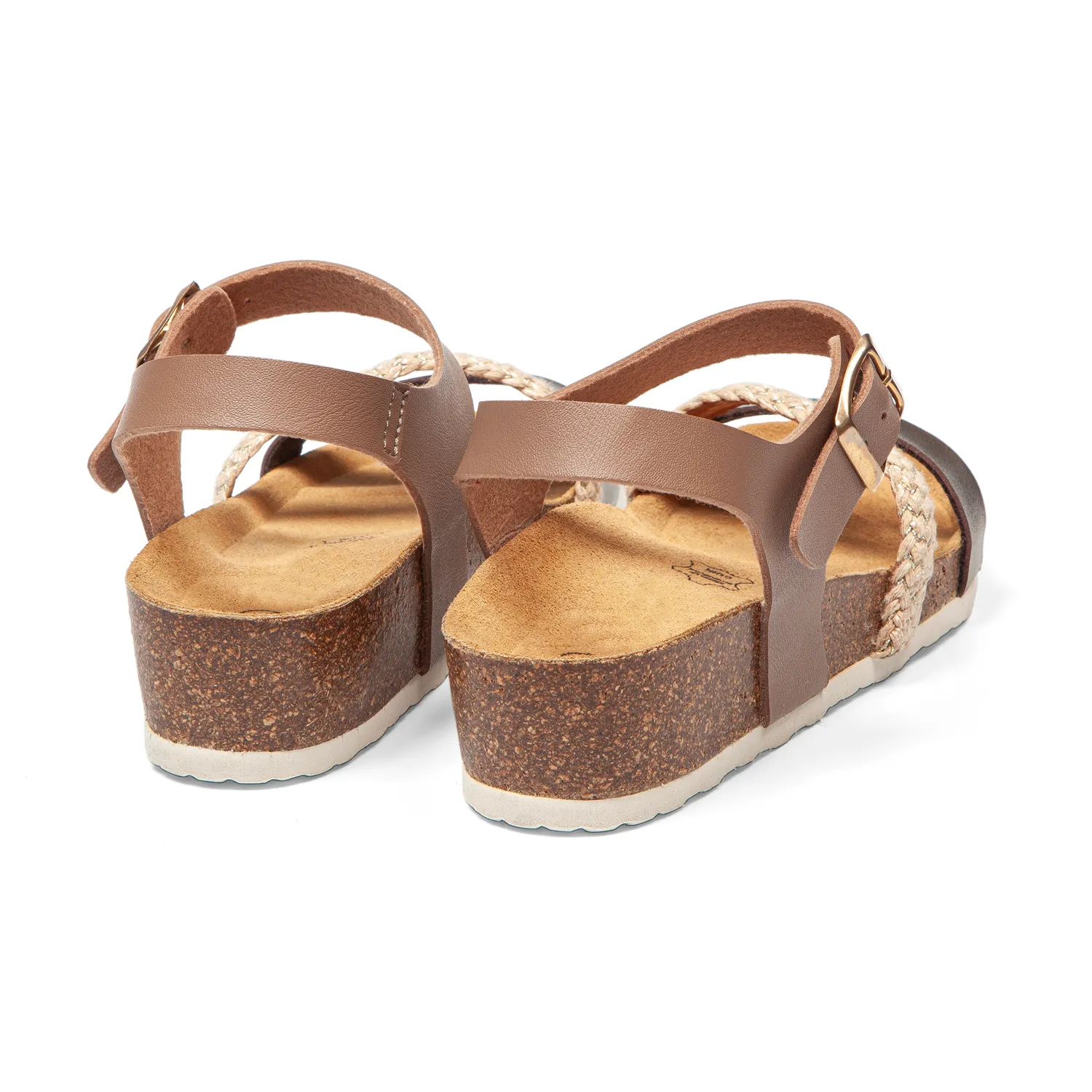 • Brides croisées synthétique + tressage écru + liège naturel apparent