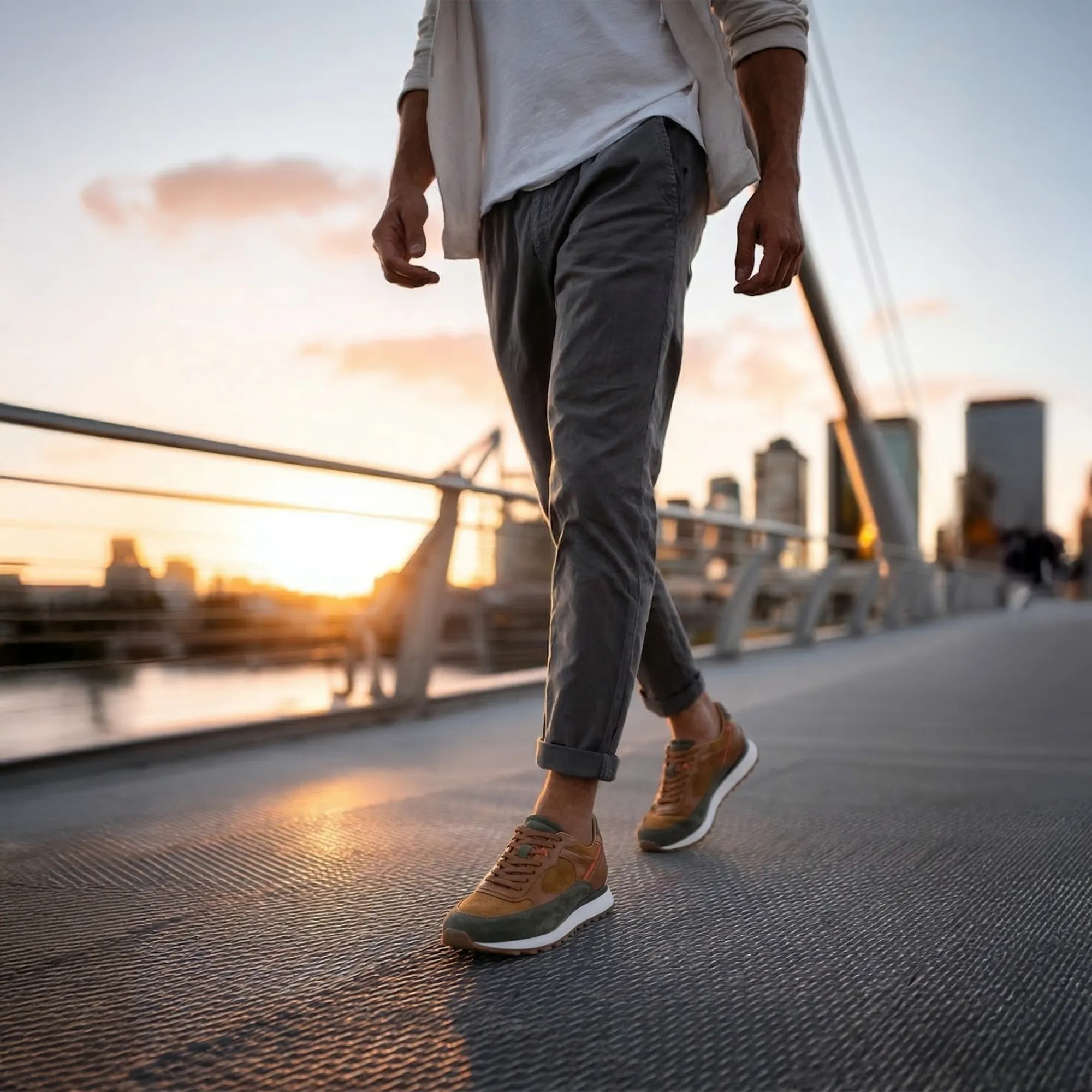 Vélo sous la pluie le matin puis rendez-vous client dans la journée : tes sneakers RIVAX KAKI COGNAC traversent toute ta semaine active sans jamais te lâcher.